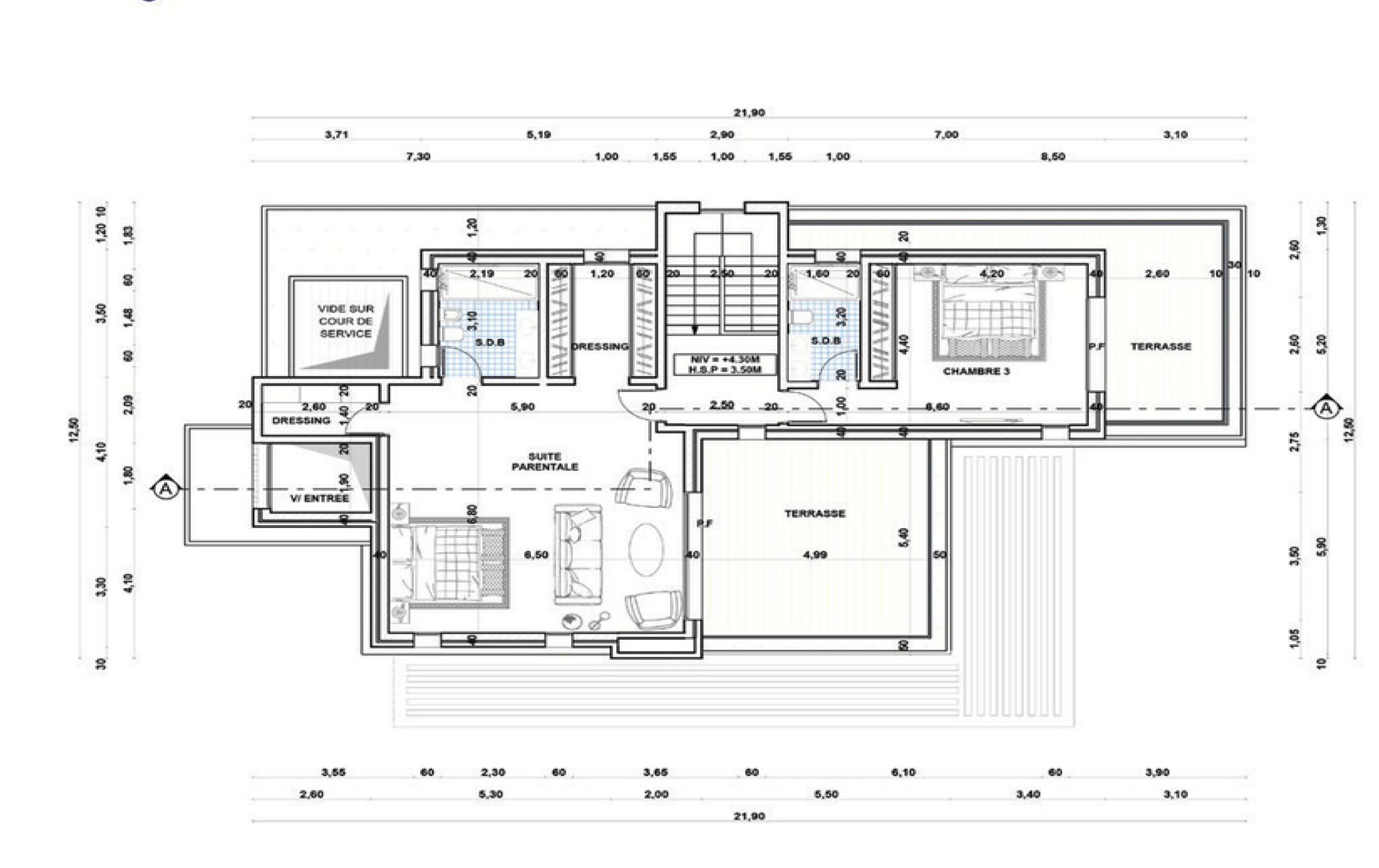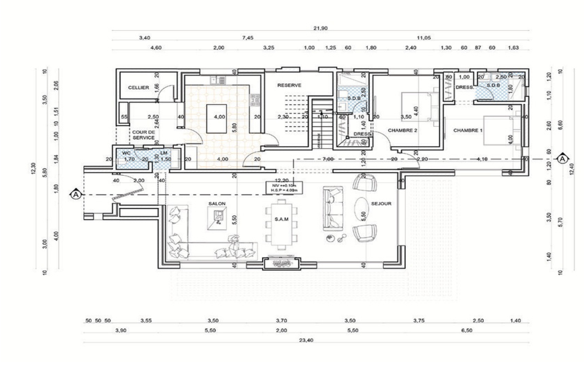 Comprenant un salon, un séjour, une salle à manger, ainsi qu'un quartier de service pratique avec cuisine semi-équipée, chambre du personnel et cellier. Deux chambres somptueuses avec salles de bains privatives et dressings, ainsi que des toilettes invités, complètent cet espace de vie. À l'étage.